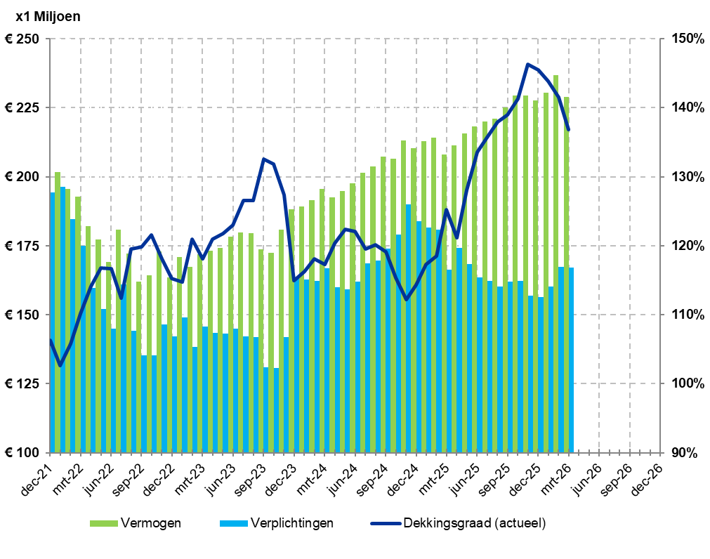 In onderstaande grafiek is de actuele dekkingsgraad weergegeven van de afgelopen jaren. De actuele dekkingsgraad wordt iedere maand berekend door het vermogen van het pensioenfonds te delen door de financiële verplichten in de toekomst (VPV).